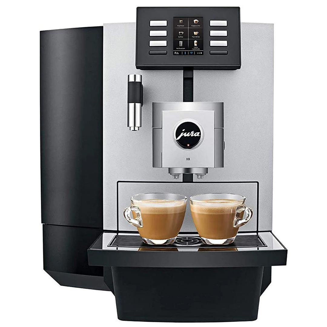 The X8 is incredibly versatile: it can prepare the full range of speciality coffees finished with milk and milk foam as well as black coffees and the classic pot of coffee. For tea lovers, it also prepares hot water at different temperature levels. With its solid, height-adjustable dual spout, it can create a speciality coffee – or even two beverages simultaneously – and dispense them into the cups or glasses, at the touch of a button. The handy cup positioning aid makes it ideal for self-service. The same goes for the large, clearly arranged preparation buttons. Different speciality coffees can be positioned wherever you like on the display, according to your needs. Whether equipped with the standard large water tank or a sturdy fresh water kit, the X8 offers excellent performance whether in mobile use or in a fixed location.