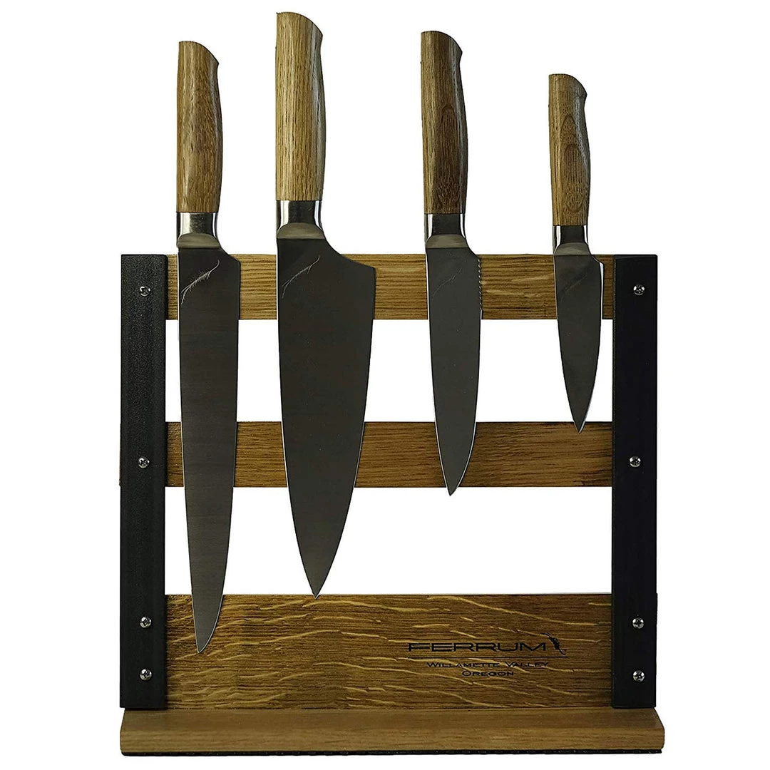 FerrumĀ blades are forged from powdered metal for greater density and purity, with 61 Rockwell hardness for exceptional edge retention. The finished blade is hand-sharpened to a 16-degree cutting angle, with a convex āapple seedā edge. Because of Ferrumās unique manufacturing process, the blade is less brittle and easier to sharpen than others of comparable hardness.