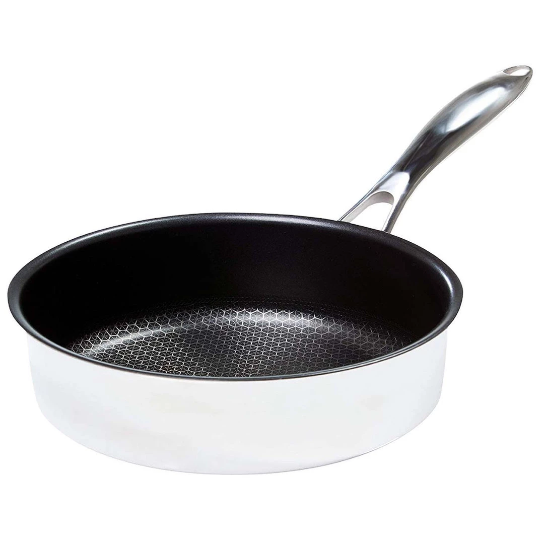 Stainless Nonstick is a raised stainless steel pattern over a recessed layer of nonstick coating. This allows for browning on stainless steel without sticking and protects the nonstick coating when using metal utensils.