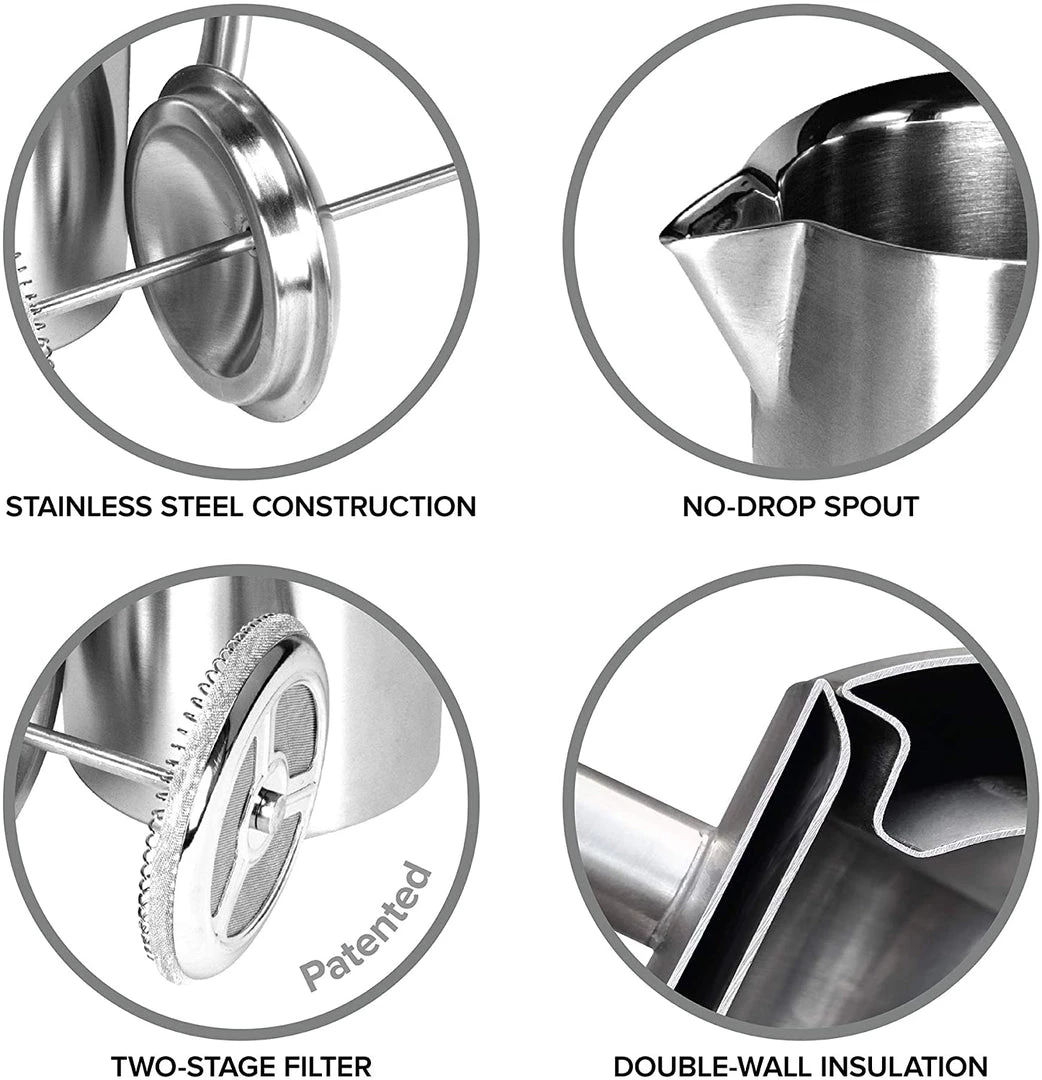 - DOUBLE-WALLED DESIGN: The double-wall design means that this coffee press will deliver hot coffee or tea for years to come. The insulated body and lid retain heat better than glass and stay hot up to 4 times longer. Also, the durable 18/10 stainless steel inside and out means no more broken glass or corrosion, and all parts are dishwasher safe.