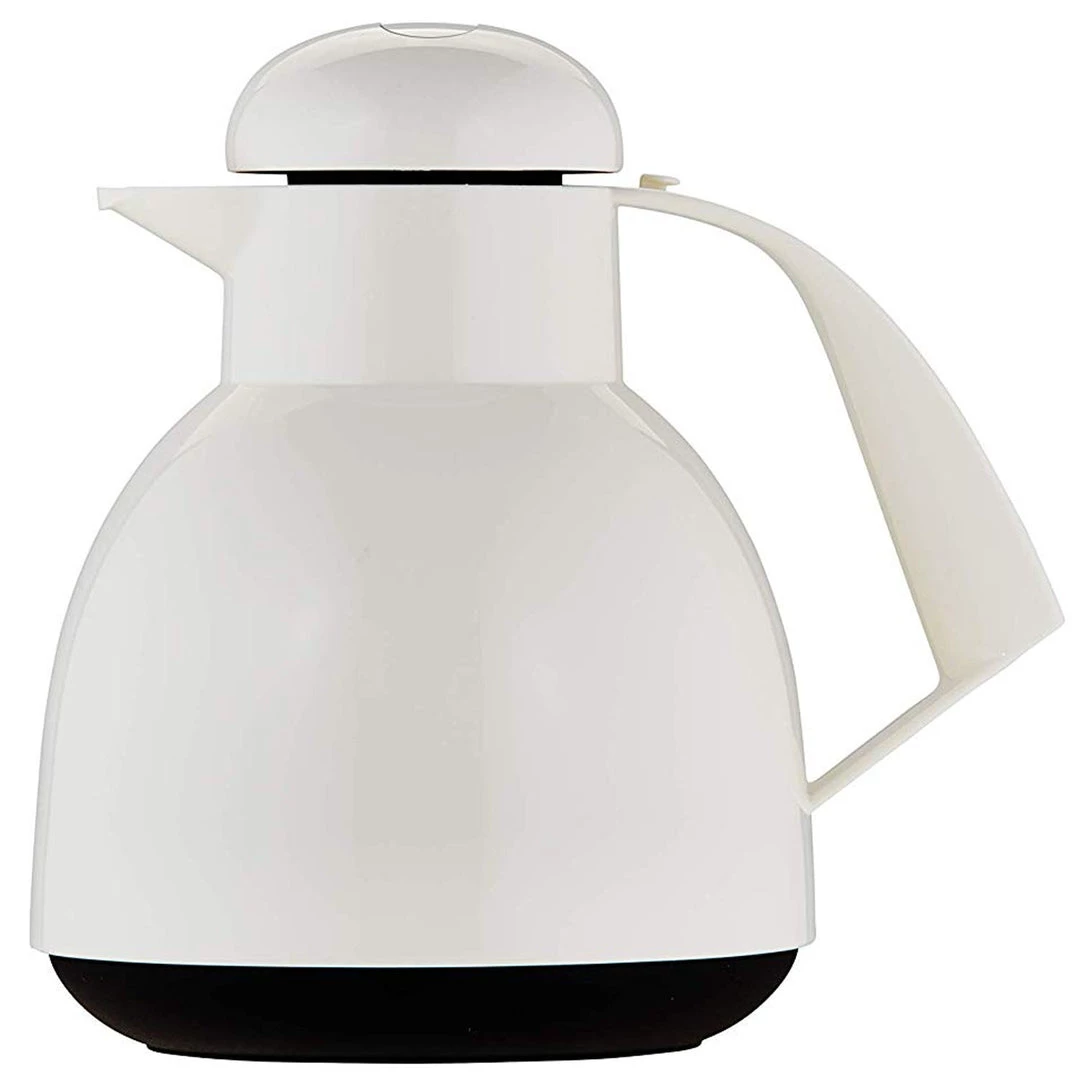Helios plastic vacuum jug with screw cap and push button integrated into the lid for one-hand operation. Very good heat retention due to vacuum-sealed and silver-plated Q100 quality glass insert. Contents ca. 1.0 l. Packed in single box.
