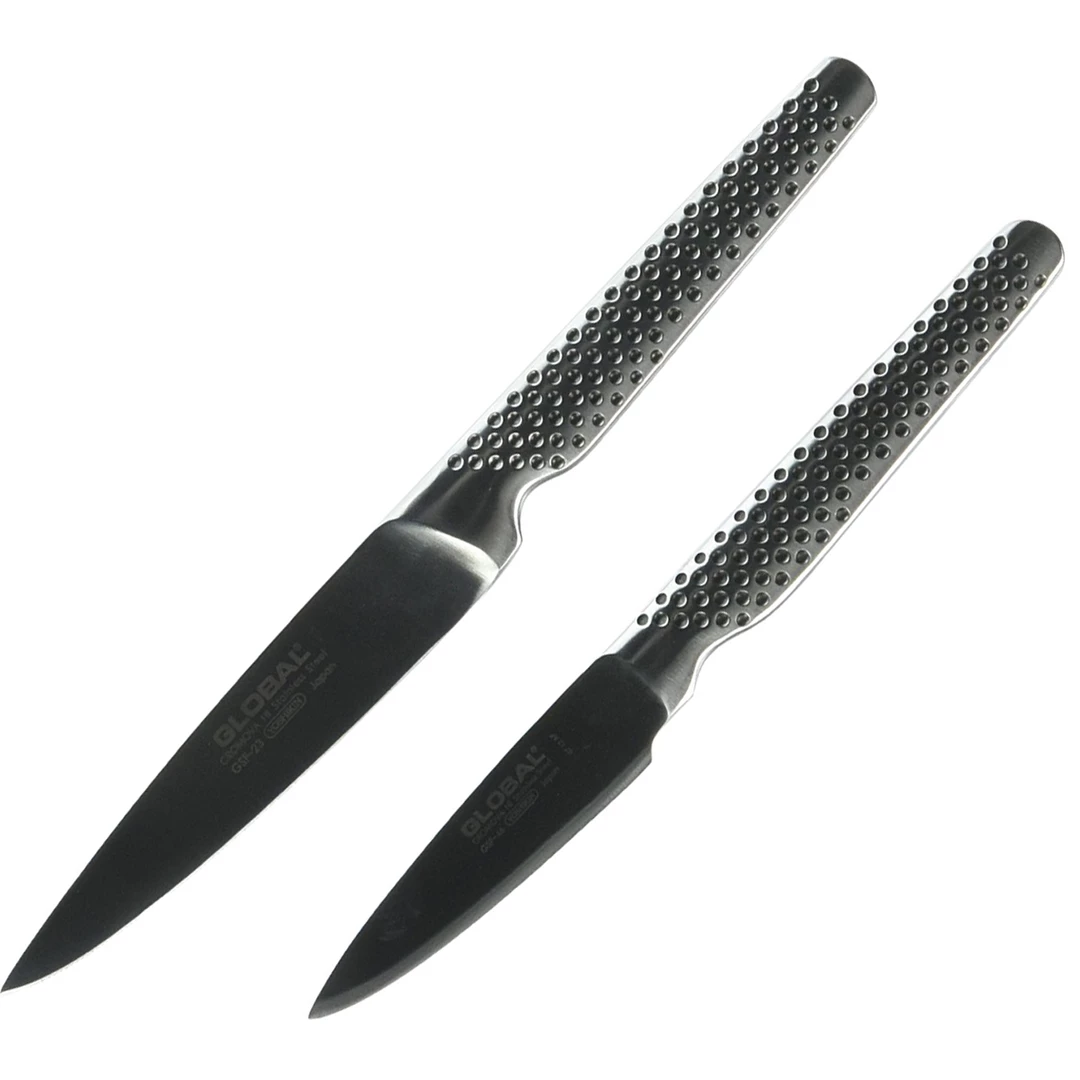 Set includes a 3-Inch Paring knife and 4.5-Inch partially micro-serrated utility knife. Global knives have two most innovative features, their edge and the way they are balanced. The most important feature of any knife is its edge, and the global edge is truly its signature. The majority of the global knives are sharpened or ground on both sides of the blade like western style knives. However, their edges are ground straight to a point rather than beveled resulting in a dramatically sharper knife which stays sharper longer. The edge is so large and prominent that it is easily seen with the naked eye and extends a quarter inch or more up from the tip of the knife