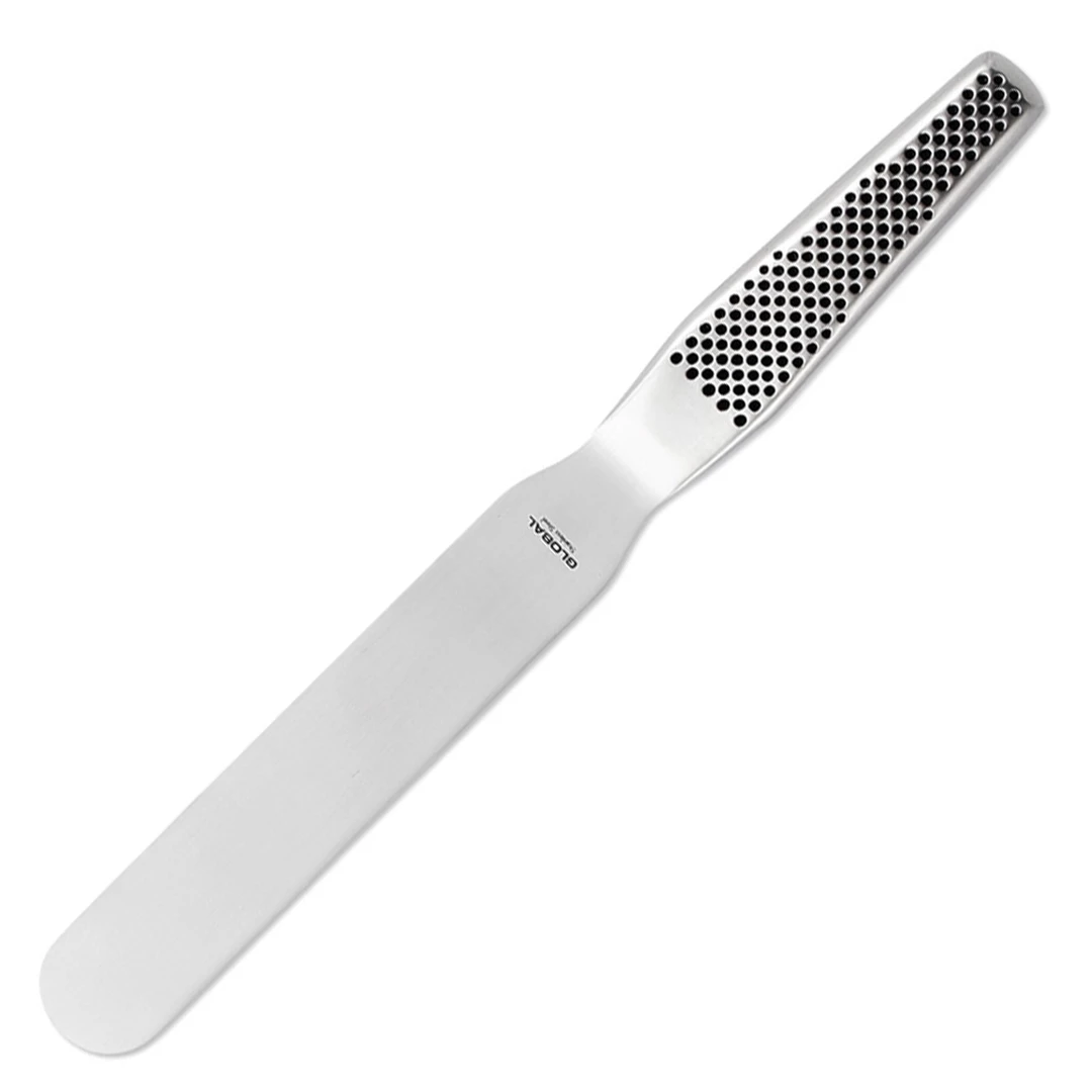 Global 6-inch spatula. Excellent for plating food carefully and cleanly, Global’s line of spatulas are used by cooks in many top restaurants. Also terrific for icing cakes or using as a spreader. Loved by professional chefs around the world, Global knives are an excellent choice for the serious home cook. The thin and razor sharp Global blade allows the cook to cleanly slice through foods, preserving the integrity of the ingredient and maximizing its flavor. The majority of Global knives are ground to a straight point rather than the western style of beveling the edge. To balance their knives Global uses a hollow handle that is filled with just the right amount of sand to create the correct balance. The handle has its own unique darkened dimples for a non-slip grip. Because the knives are very light weight they reduce hand fatigue. Global knives have a smooth contour and seamless, all stainless construction that eliminates food and dirt traps. Global knifes are forged in Japan from cromova 18-stainless steel, a blend of 18-percent chromium for good stain resistance plus molybdenum and vanadium which gives excellent edge retention.