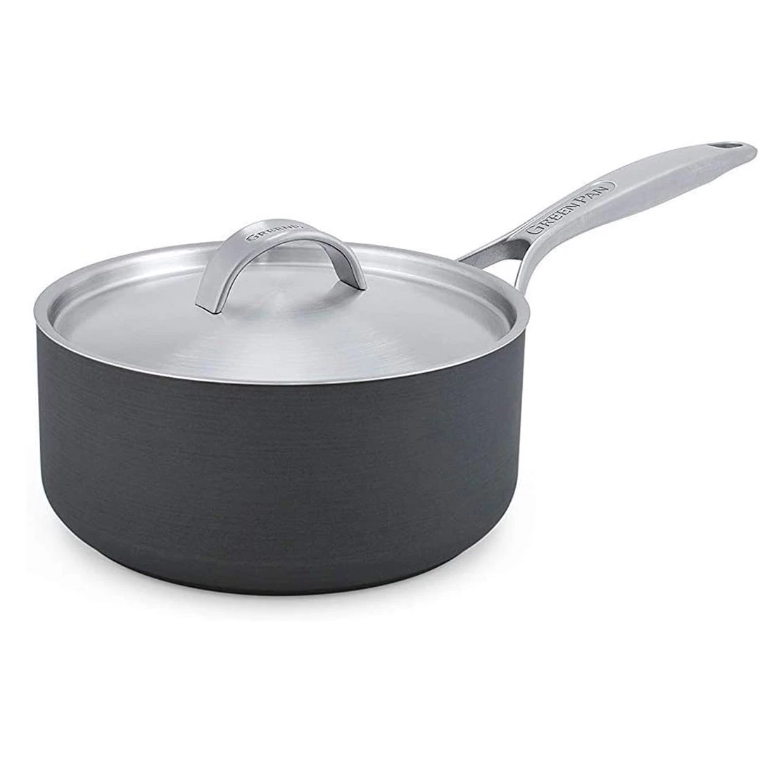 The GreenPan Paris 3 Quart Covered Sauce Pan is the perfect mix of class and convenience. Paris is made of durable hard anodized aluminum for even heat conduction and complete with a matte dishwasher safe coating. Eye catching ergonomic stainless steel handles are riveted for a strong hold, allowing for oven use. Each piece is coated with Thermolon Marathon healthy ceramic non-stick, giving you a healthy cooking surface for every meal.