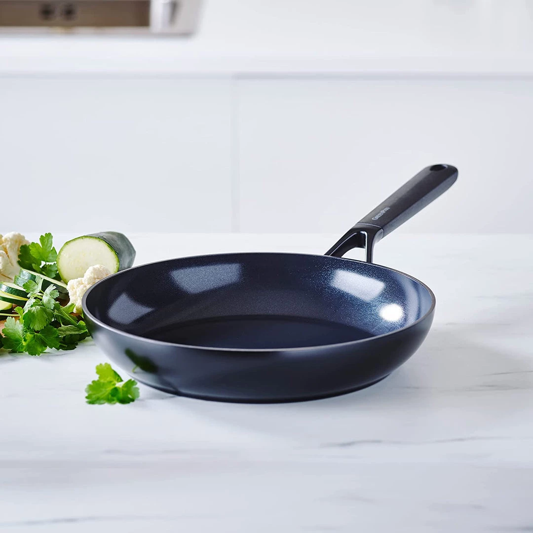 SmartShape is a smarter way to cook. This frying pan is crafted from aluminum, which means it’s extra tough and produces incredible results all on stovetops, except induction. The handle stays cool thanks to the rivetless v-shaped design, which allows these pans to store and stack easily. This pan is finished with our diamond-reinforced ceramic nonstick coating for unparalleled performance and effortless cleanup. Dishwasher safe. Oven safe to 320°F..