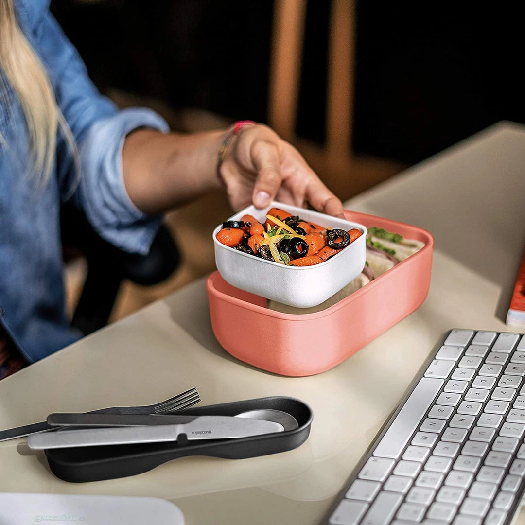 Lunch box with inner container great for transporting and serving food outside the house. Definitely practical, microwave safe with lid, dishwasher safe and safe thanks to the airtight lid with double closed. Holds up to 900ml.