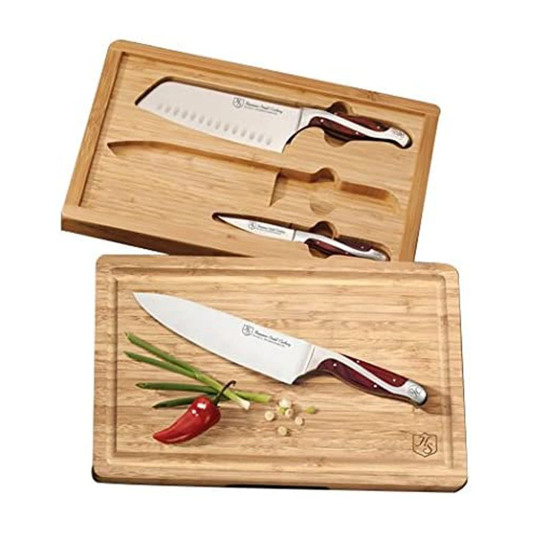 3-piece set combines three of the most useful knives in the home (8″ chef, 7″ vegetable cleaver, and 3.5″ paring knife) with a beautiful storage case and cutting board combo.