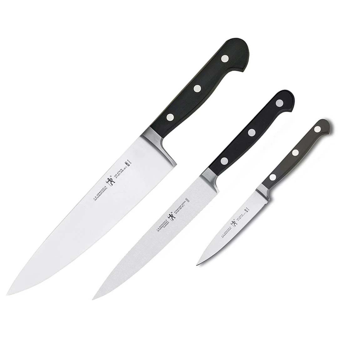 Prepping is easy with the Henckels International CLASSIC 3-pc Starter Knife Set. Honed for long-lasting sharpness, the fine-edge blades are perfect for precision cuts. Effortlessly chop herbs with the 8″ Chef’s Knife, slice cheese with the 6″ Utility Knife and peel apples with the 4″ Paring Knife.