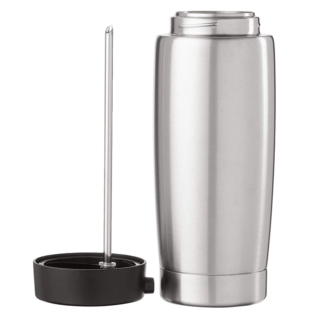 The elegantly shaped, stainless steel vacuum milk container is a practical addition for all lovers of milk specialities. Thanks to its familiar tried-and-tested principle, it holds 20 oz. and keeps the milk cool throughout the day.