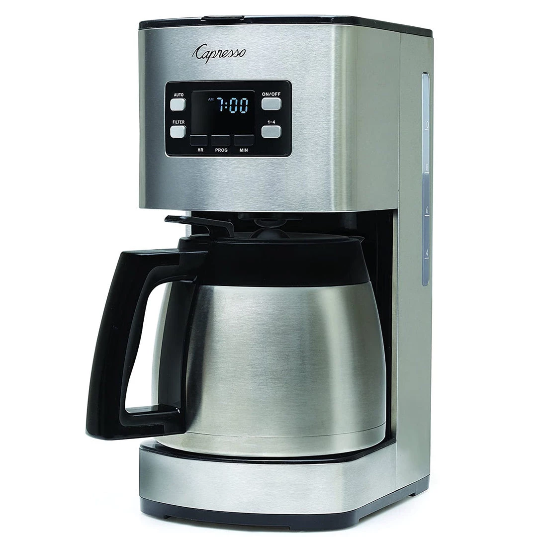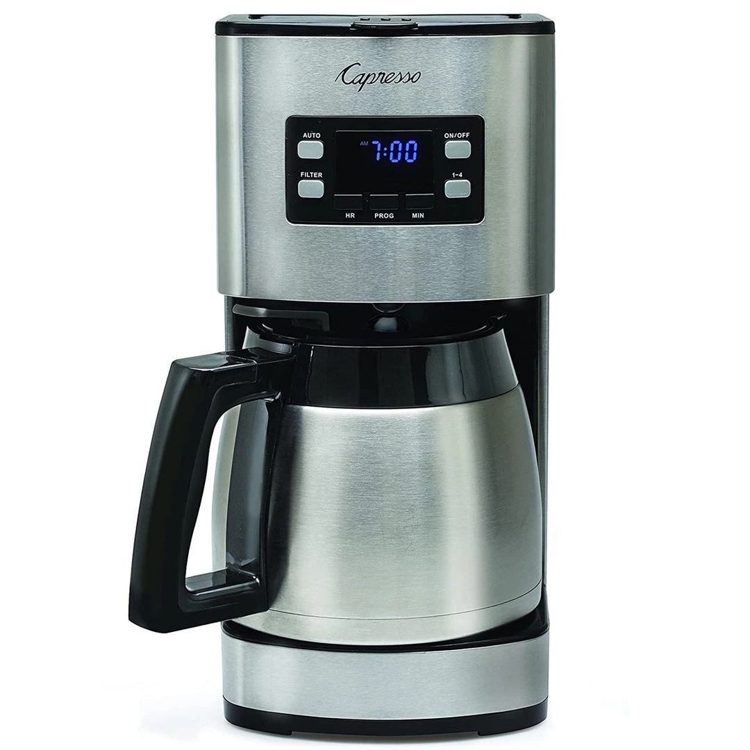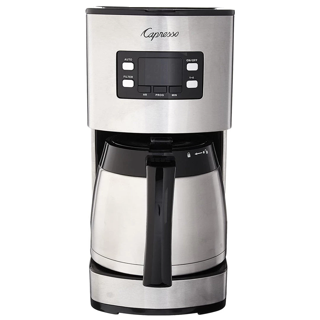 Start your day off right with a cup of Coffee from the St300 coffeemaker from Capresso. This Stainless Steel finished coffeemaker includes a Stainless Steel carafe capable of holding 10 Cups of Coffee, perfect for family breakfasts or office break rooms and has a feature to maximize flavors when only making a half carafe at home. The St300 has a drip stop function so you can take the carafe out and pour yourself a cup Midway through the brewing process. This coffeemaker includes a charcoal filter and a holder, while the maker features a filter indicator light that alerts you when the filter needs to be replaced. Most conveniently, the St300 is equipped with an automatic shut-off function to keep things safe and energy efficient. The St300 is backed by a one year from the manufacturer as part of Capresso commitment to quality.