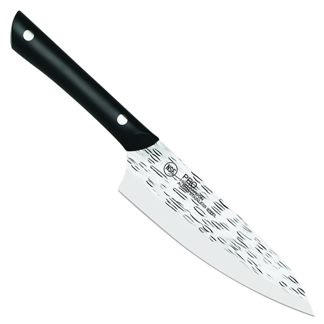 Bring professional-level performance to your kitchen with Kai PRO. NSF Certified for use in professional kitchens, Kai PRO cutlery offers a razor-sharp edge, comfortable grip, precision handling—and is built to stand up to the rigors of commercial use. Kai PRO blades are made of Japanese AUS6M stainless steel, hand sharpened and finished to a 16° cutting edge on each side—much sharper than standard Western-style knives. Our high-carbon steel offers excellent corrosion resistance, holds its edge well, then re-sharpens easily when needed. With its striking, hammered blade finish, Kai PRO is sure to be a standout in any kitchen, home or commercial. The knife’s beautiful finish isn’t just for show; it reduces drag and helps food release from the blade quickly and easily. Full-tang construction and a riveted POM handle ensure Kai PRO cutlery will provide you with a lifetime of pro-level performance.