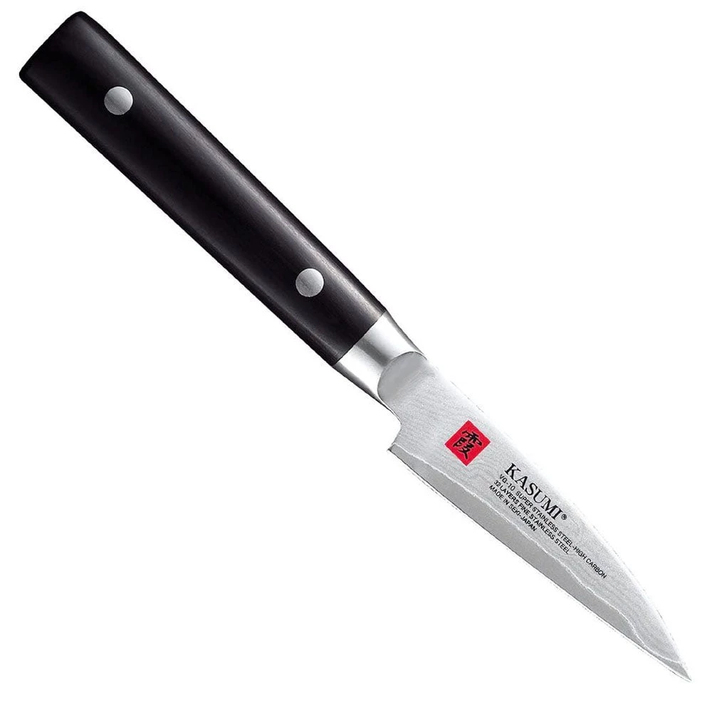 Kasumi knives are produced by Sumikama Cutlery in Seki, Japan. Sumikama Cutlery specializes in producing knives from the most advanced materials with the most advanced manufacturing techniques. Kasumi V-Gold No. 10 Damascus Pattern knives are made from 33 layers of stainless steel. Only the middle layer acts as the cutting edge, and it is made using V-Gold No. 10 stainless steel. V-Gold No. 10 is a high carbon stainless steel with cobalt, manganese, molybdenum and vanadium for added durability and ease of sharpening. The addition of cobalt to this steel requires special tempering in order to maximize the full benefit of this steel. Sumikama’s technique for this special tempering is a closely guarded secret.