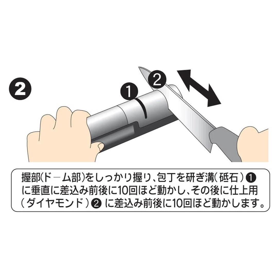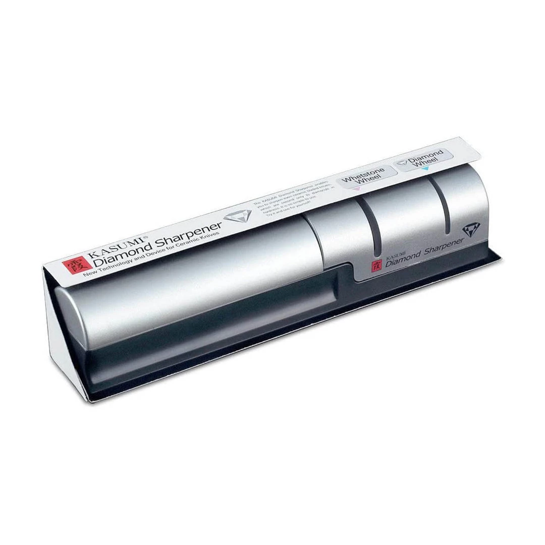 This sharpener by Kasumi enables you to sharpen even ceramic bladed knives, which are second only to diamonds in hardness. It is simple and easy to use. It features two wheels, one is a ceramic whetstone wheel while the other is diamond. Use the diamond stage for your fine ceramic knives, and use the whetstone for your Japanese style metal blade knives. It uses water for lubrication and is easy to clean. Use this sharpener with your Kasumi brand knives, and any other slim Japanese style blades. Not for use with the broader European blades. Made in Seki, Japan.