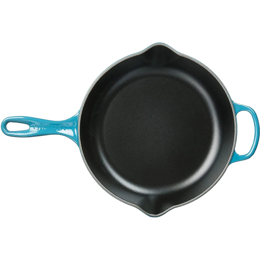Cast iron skillets have long been treasured kitchen staples for stove-top frying and oven baking. Over time, the matte black interior enamel develops a natural patina that is ideal for searing and frying. Pour spouts on two sides allow for drip-free pouring.