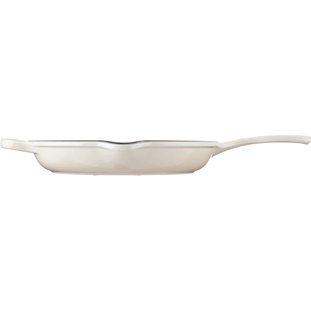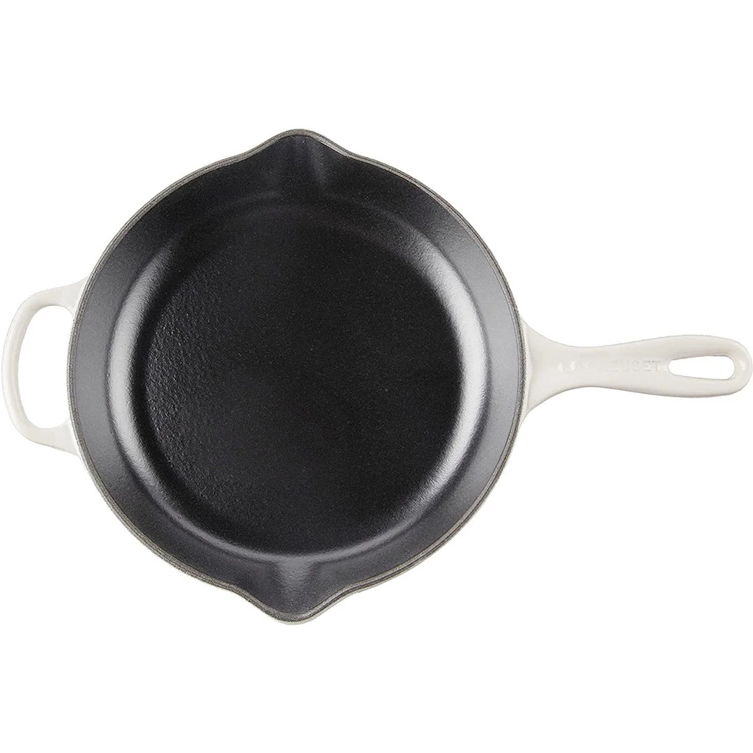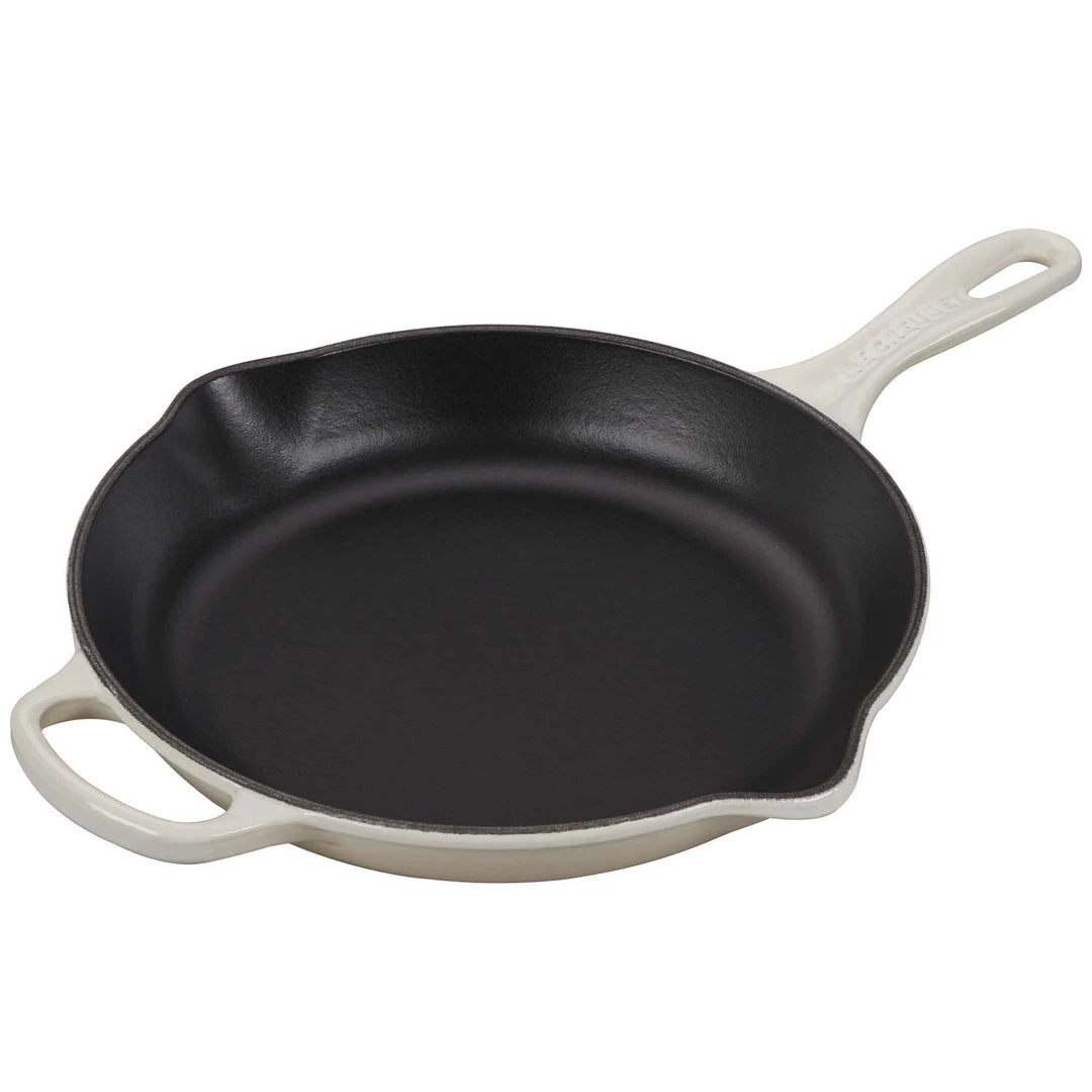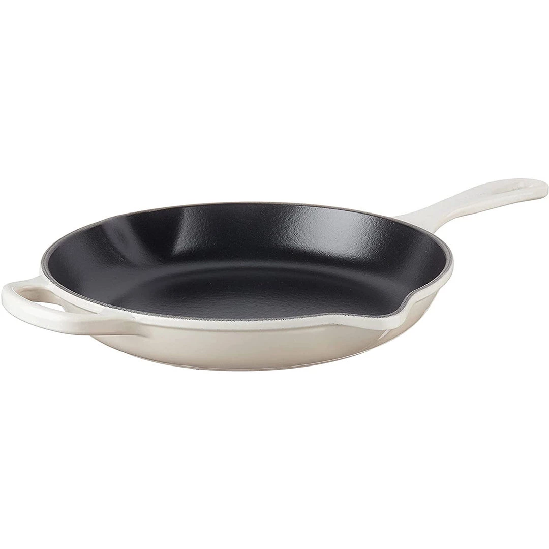 Cast iron skillets are indispensable in the kitchens of home cooks and professional chefs alike. The interior surface of a Le Creuset skillet is finished with a matte black enamel that eliminates the need for the traditional seasoning and maintenance of raw cast iron. Specially formulated for high-surface temperature cooking, the enamel develops a natural patina over time that is ideal for searing, sauteing and frying.