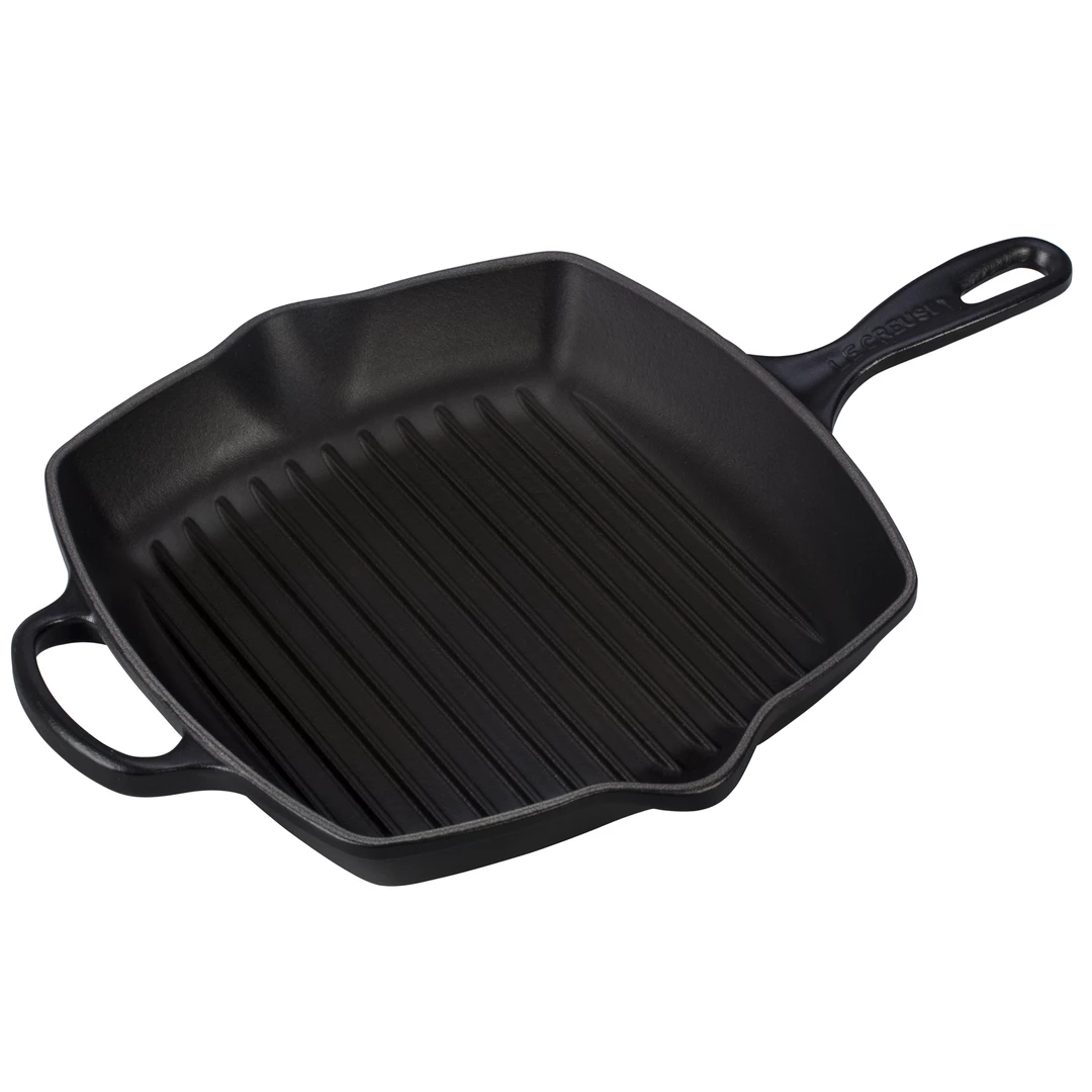 The square Skillet Grill’s interior is coated with Le Creuset’s protective satin black finish to prevent damage and wear. Over time, this slightly abrasive interior develops a natural patina that is ideal for searing and frying.