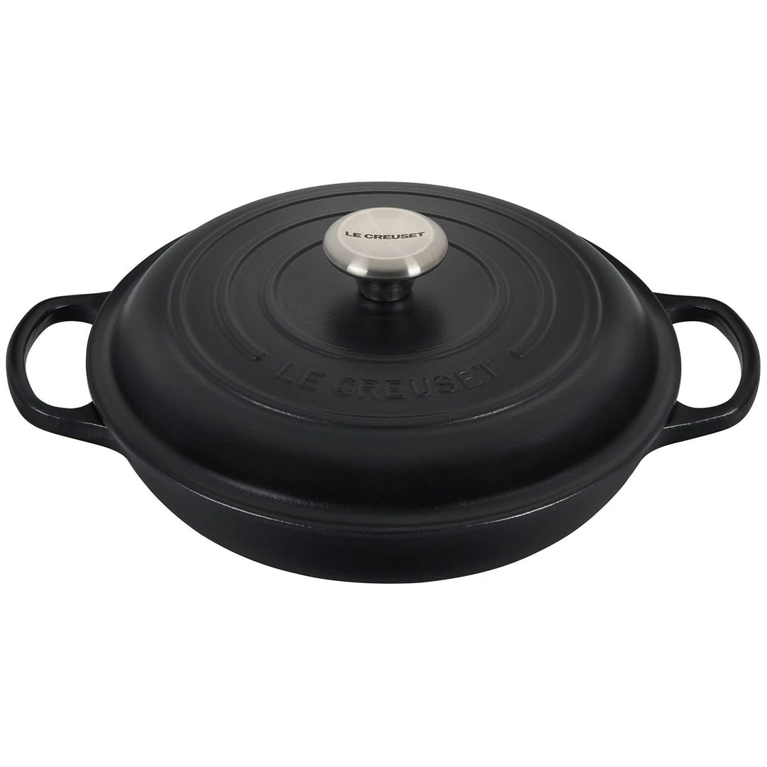 The enameled cast iron braiser is uniquely designed for maximum performance, transforming tough cuts of meat and hearty vegetables into tender, flavorful dishes. Food is first seared over high heat, then finished slowly in a flavorful liquid. The wide base of the braiser allows ingredients to be placed in a single layer for proper searing; once liquid is added, the domed lid continuously circulates steam to lock in moisture and flavor.