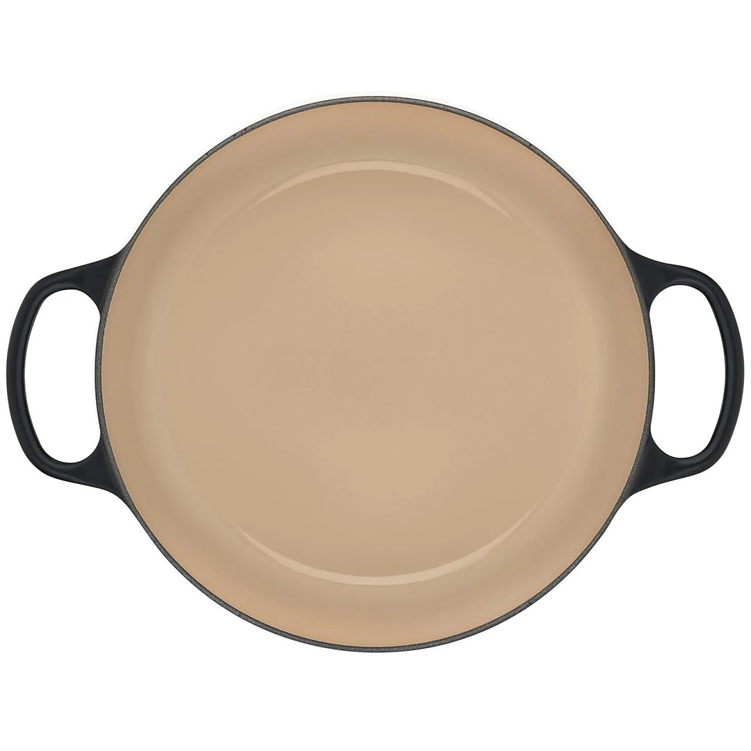 - Sand-colored interior enamel has a smooth finish that promotes caramelization, prevents sticking and resists stains