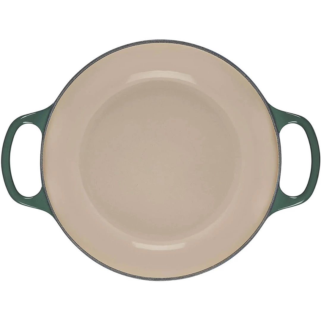 A sauteuse pan has sloping sides and a large surface area ideal for simmering and reduction. It’s a versatile shape that also works for searing, sauteing, braising, and frying. Its cast-iron construction enhances the cooking process by evenly distributing heat and locking in the optimal amount of moisture. The interior enamel resists chipping and cleans evenly, and ergonomic handles provide a secure grip, even while wearing oven mitts.