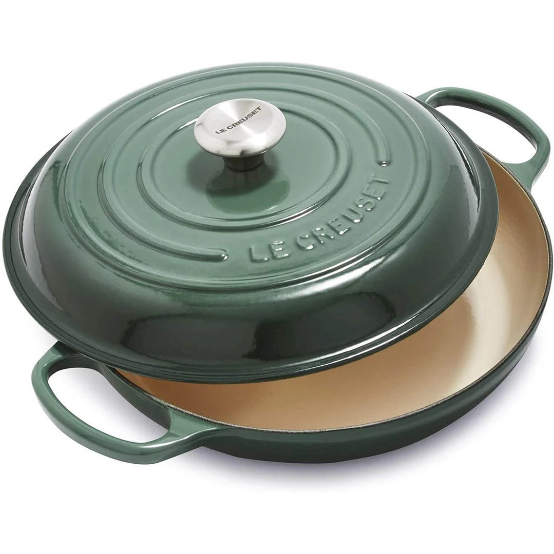 The enameled cast iron braiser is uniquely designed for maximum performance, transforming tough cuts of meat and hearty vegetables into tender, flavorful dishes. Food is first seared over high heat, then finished slowly in a flavorful liquid. The wide base of the braiser allows ingredients to be placed in a single layer for proper searing; once the liquid is added, the domed lid continuously circulates steam to lock in moisture and flavor.
