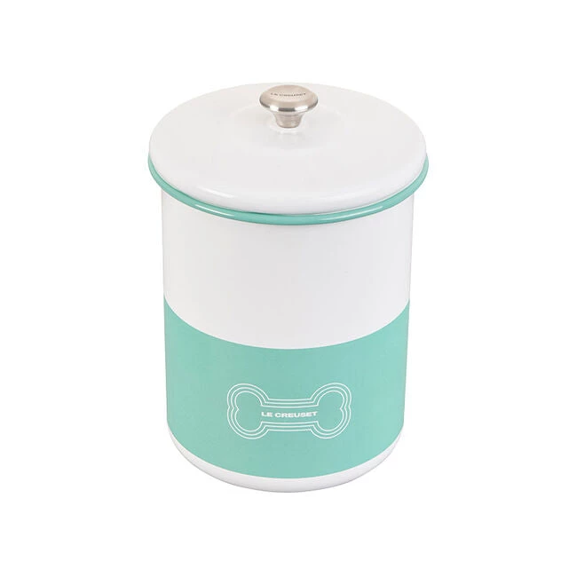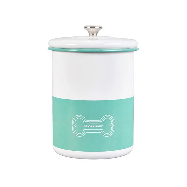 The Le Creuset Treat Jar is a stylish way to create happy meals for happy dogs. Crafted from human-grade carbon steel, the jar has a generous 4 1/4 quart capacity that is paw-fect for storing kibble and tasty treats. It’s finished with a colorful glaze and our iconic three rings in a fetching dog bone design, and topped with a signature stainless steel knob that coordinates with other Le Creuset cookware. As dependable as your best friend, the enamel coating is hygienic, easy to clean, and resistant to chips, stains, scratches and rust. Bone appétit! · Crafted from premium carbon steel to keep food hot or cold.
