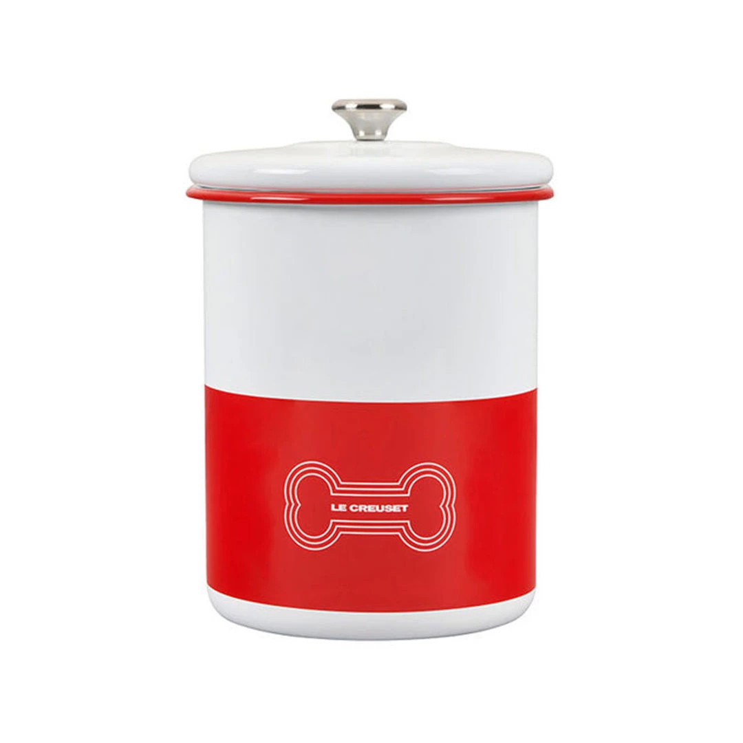 The Le Creuset Treat Jar is a stylish way to create happy meals for happy dogs. Crafted from human-grade carbon steel, the jar has a generous 4 1/4 quart capacity that is paw-fect for storing kibble and tasty treats. It’s finished with a colorful glaze and our iconic three rings in a fetching dog bone design, and topped with a signature stainless steel knob that coordinates with other Le Creuset cookware. As dependable as your best friend, the enamel coating is hygienic, easy to clean, and resistant to chips, stains, scratches and rust. Bone appétit! · Crafted from premium carbon steel to keep food hot or cold.