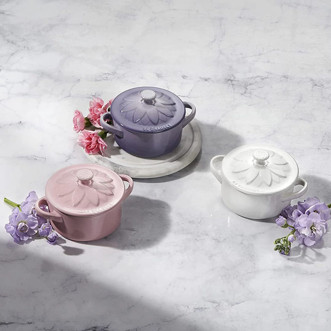 The Mini Cocotte with Flower Lid will add a touch of springtime joy to the kitchen. Featuring a delicate embossed flower pattern on the lid and knob, it’s perfect for sharing lovingly made individual cobblers, gratins and pot pies. Our best-selling Mini Cocottes are also versatile for prepping and storing ingredients or use them as a light-hearted decorative accent. Crafted from premium stoneware to ensure food is cooked to perfection from oven to table, the glaze is virtually nonstick for easy cleanup.