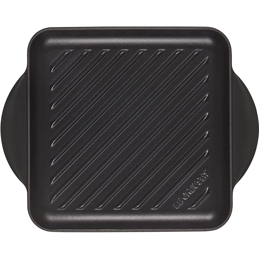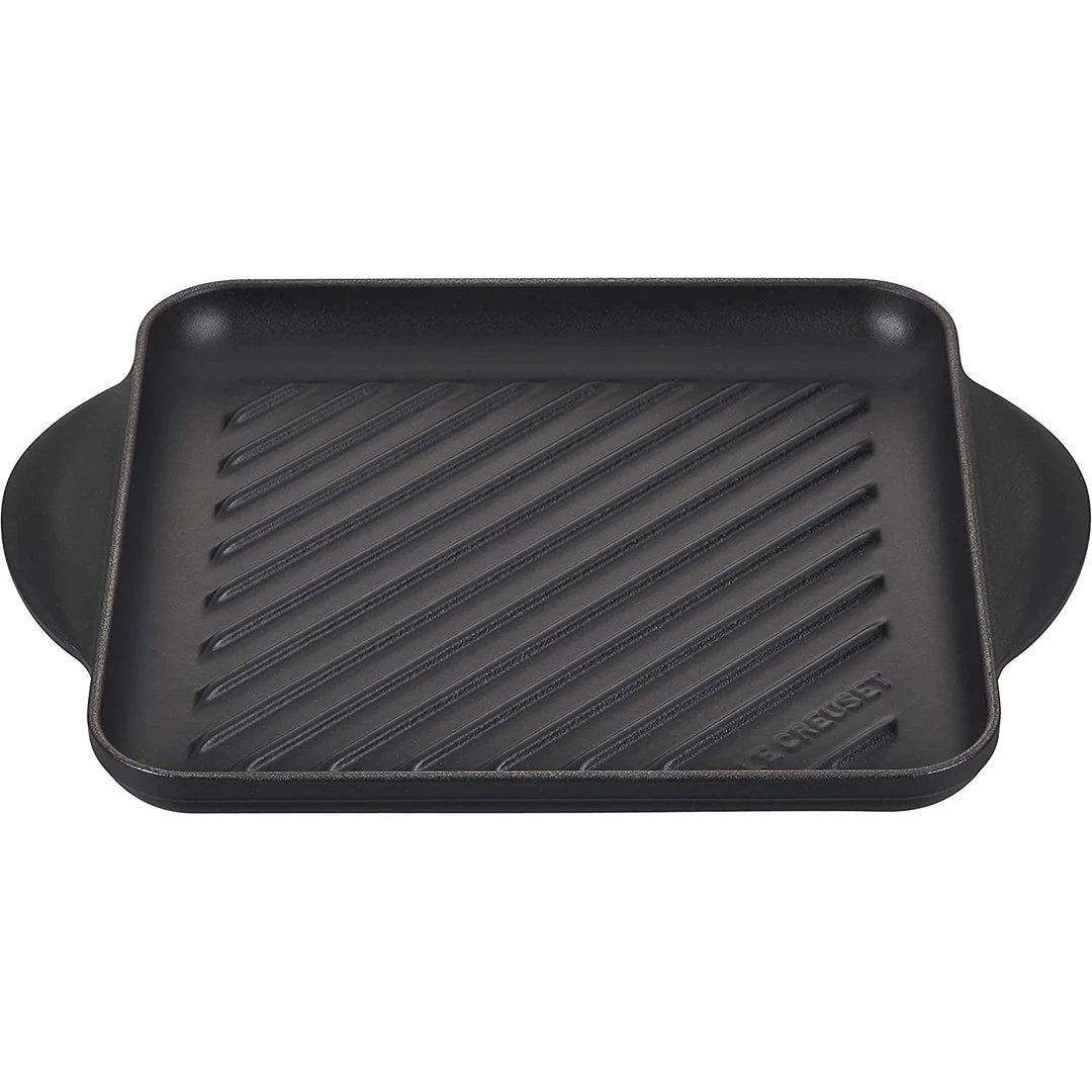 The enameled cast iron square Grill brings the delicious flavor of outdoor grilling conveniently indoors. The interior surface is finished with a black satin enamel that eliminates the need for the traditional seasoning and maintenance of raw cast iron. Specially formulated for higher surface temperature cooking, the enamel develops a natural patina over time that is ideal for searing. The high ridges create perfect sear marks and allow excess fat and grease to drain away from the food.