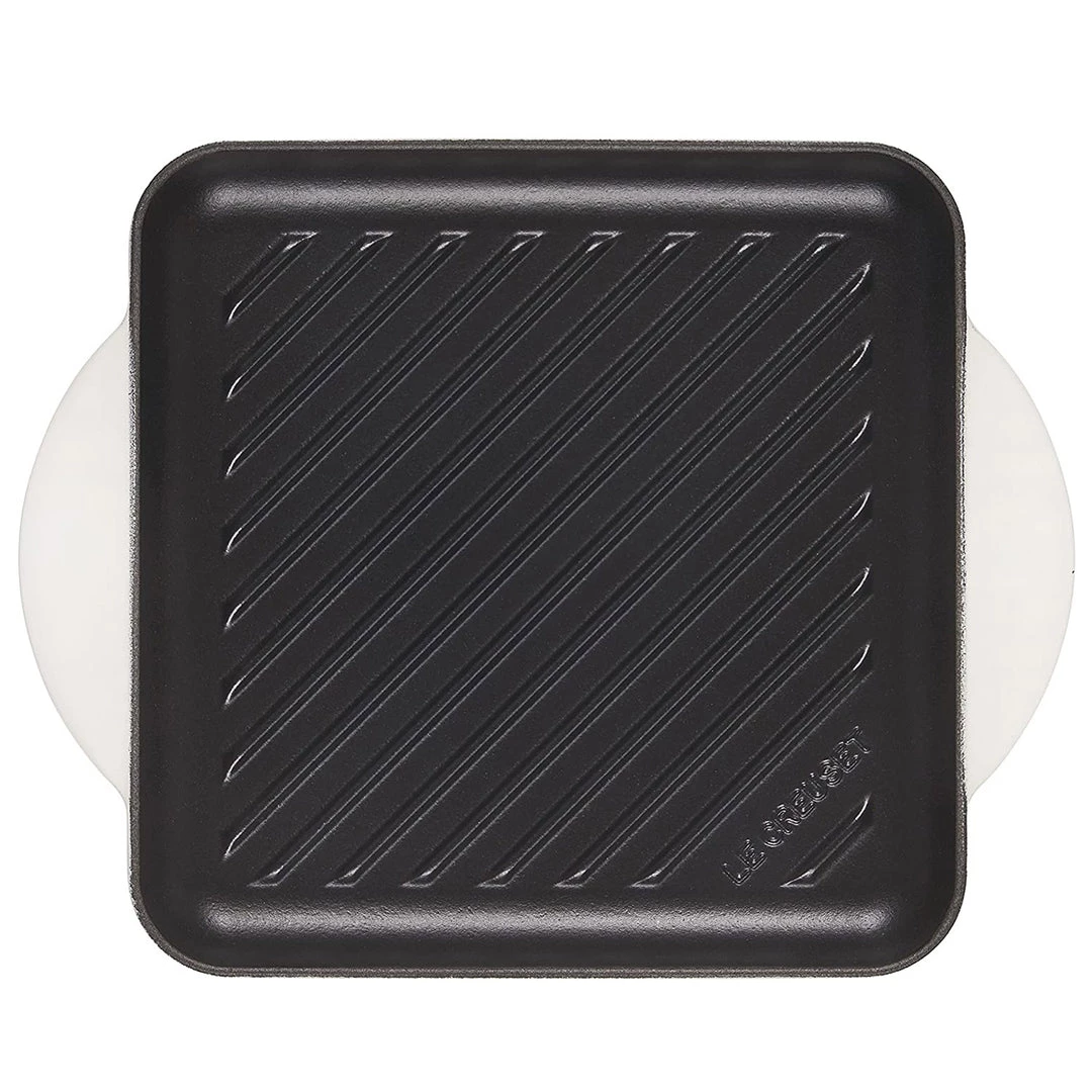 The enameled cast iron square Grill brings the delicious flavor of outdoor grilling conveniently indoors. The interior surface is finished with a black satin enamel that eliminates the need for the traditional seasoning and maintenance of raw cast iron. Specially formulated for higher surface temperature cooking, the enamel develops a natural patina over time that is ideal for searing. The high ridges create perfect sear marks and allow excess fat and grease to drain away from the food.