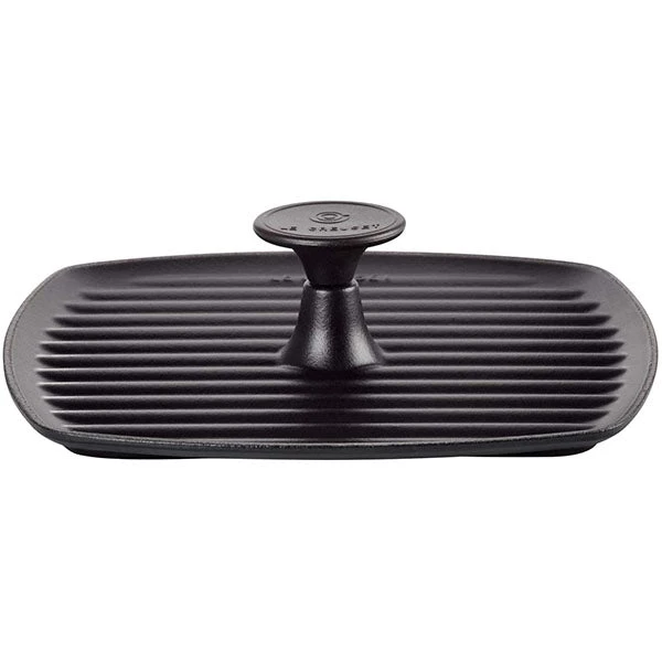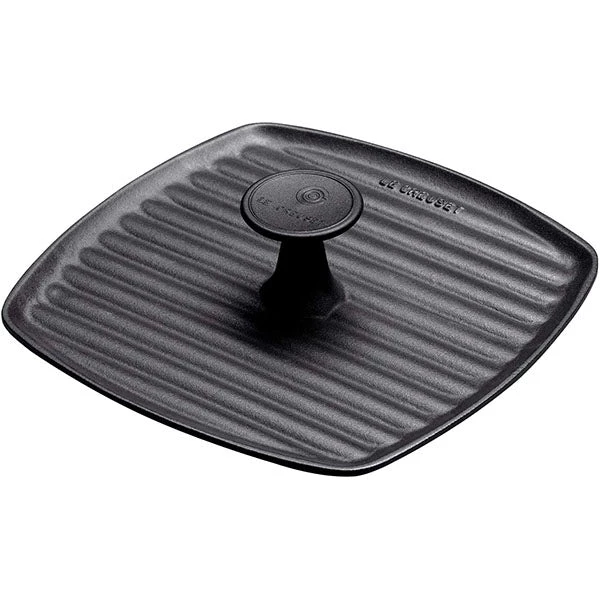 Crafted from durable cast iron, the panini press simultaneously heats the top of grilled sandwiches as they heat along the bottom in the square Skillet Grill. The ribbed, weighted press also features a convenient phenolic knob for the safe and secure lifting of the press when cooking is complete.