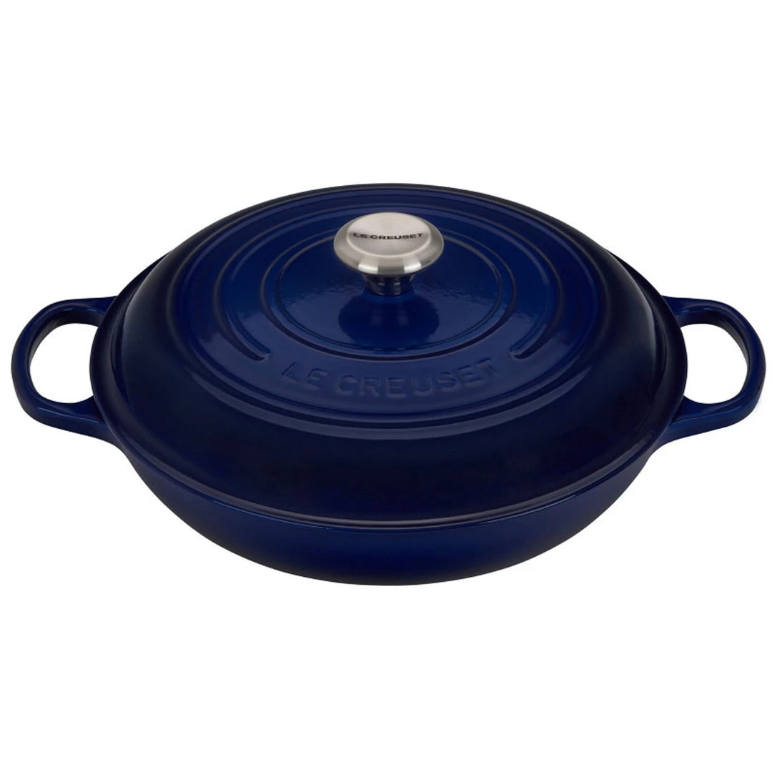The enameled cast iron braiser is uniquely designed for maximum performance, transforming tough cuts of meat and hearty vegetables into tender, flavorful dishes. Food is first seared over high heat, then finished slowly in a flavorful liquid. The wide base of the braiser allows ingredients to be placed in a single layer for proper searing; once liquid is added, the domed lid continuously circulates steam to lock in moisture and flavor.
