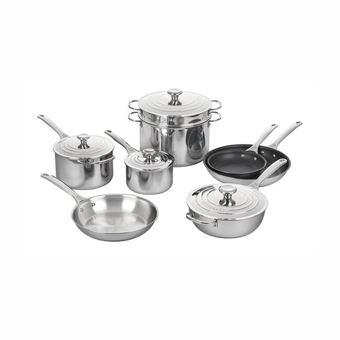 Set includes: 8″ nonstick stainless steel fry pan, 12″ nonstick stainless steel fry pan, 10″ stainless steel fry pan, 2 qt. saucepan with lid, 4 qt. saucepan with lid, 3 1/2 qt. saucier pan with lid, 9 qt. stockpot with deep colander insert and lid