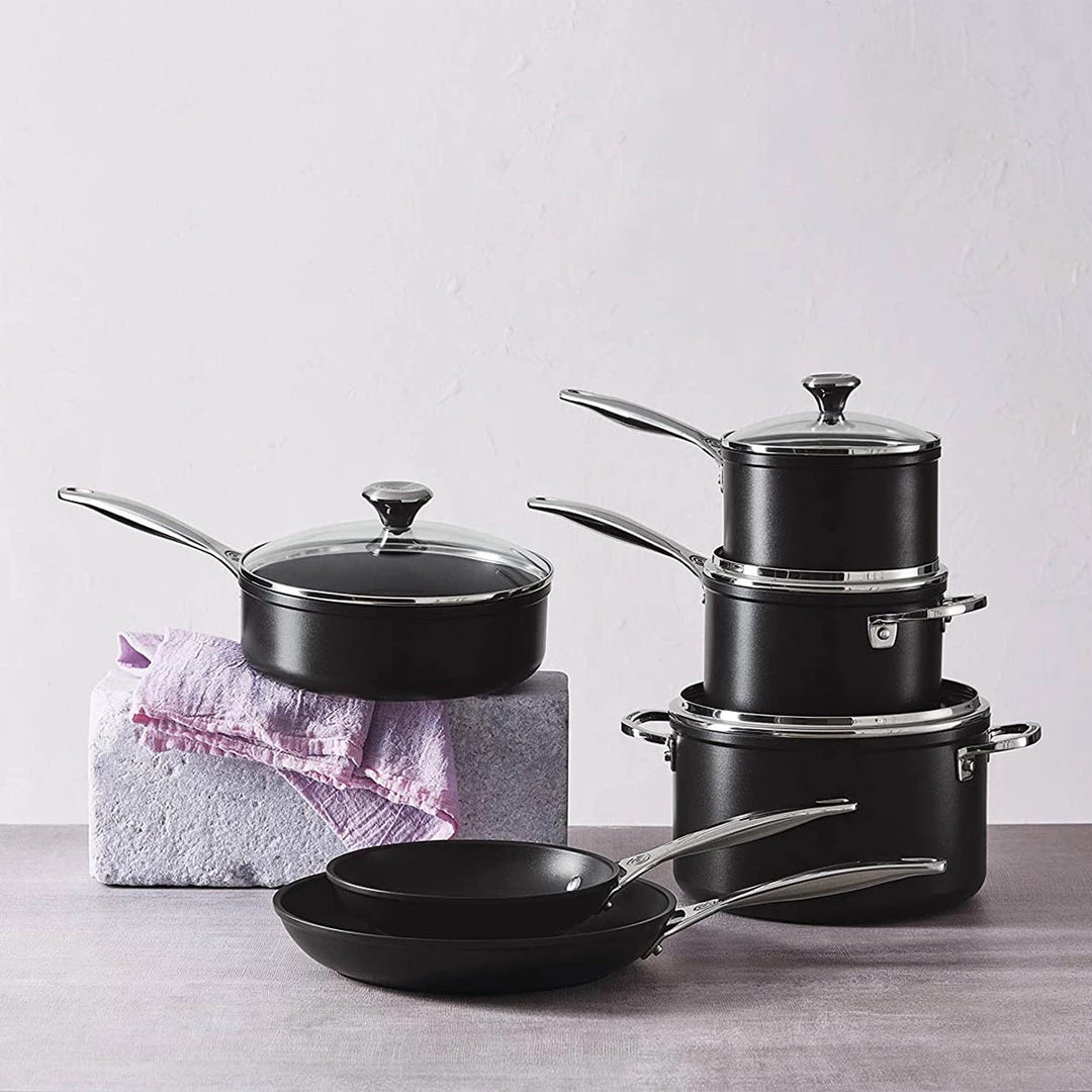 The 13-piece Toughened Nonstick PRO cookware set features our best selling pots and pans, and includes the essentials for those starting out or outfitting a new home. Now 4x stronger, Le Creuset’s Toughened Nonstick PRO nonstick pans deliver superior results and everyday ease of use for everything from searing fish to sautéing vegetables and making omelets. Each exceptionally versatile pan features a textured triple-reinforced PFOA-free coating that is ideal for browning and searing, with or without oil, and easily wipes clean. Safe for dishwasher, oven and metal utensils, Le Creuset’s nonstick is the choice for mastering flavorful meals from stove to oven to table.
