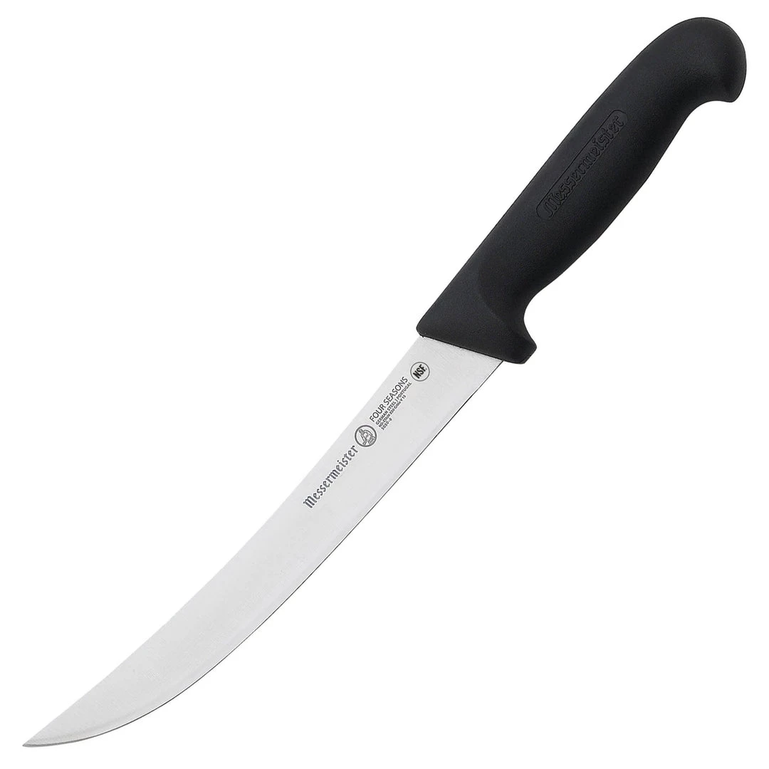 The Messermeister Four Seasons Breaking Knife is used to break down large quarters of beef, pork or lamb into smaller roasts and pieces. This knife is an excellent choice for most butchering work. This long stamped blade curves upward to a pointed tip and is attached to a non-slip handle. Preferred by culinary professionals and butchers, this knife is designed to ‘break’ through skin, cartilage and small bones. The razor sharp blade trims through fat and easily portions out larger cuts into individual portions.