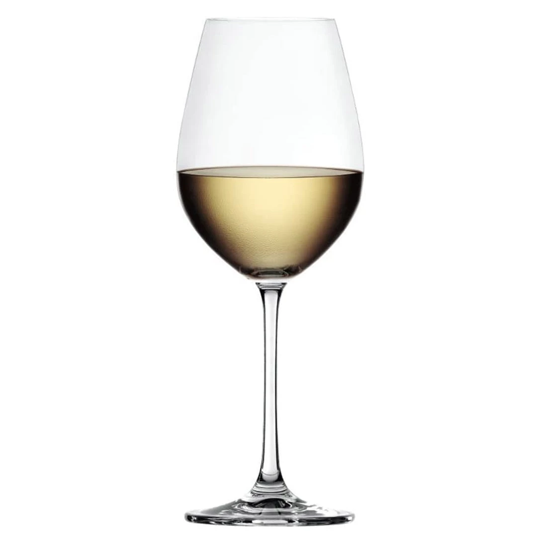 A wine glass is a type of glass stemware that is used to drink and taste wine. It is generally composed of three parts: the bowl, stem, and foot. Selection of a particular wine glass for a wine style is important, as the glass shape can influence its perception. This German, machine made , fine crystal glass is perfect for any white wine.