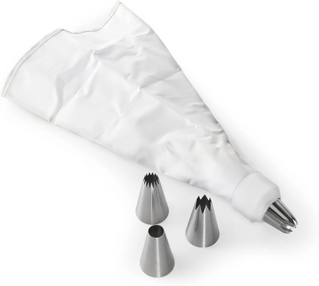 The finishing touches to compliment our everyday and Bundt bake ware. From prepping to mixing to serving, we have got you covered with all essentials. For easy cake, cupcake and cookie decorating, this set includes four extra large 2-inch metal frosting tips, plus coupler and reusable cloth icing bag. Coupler mechanism allows you to change tips during decorating