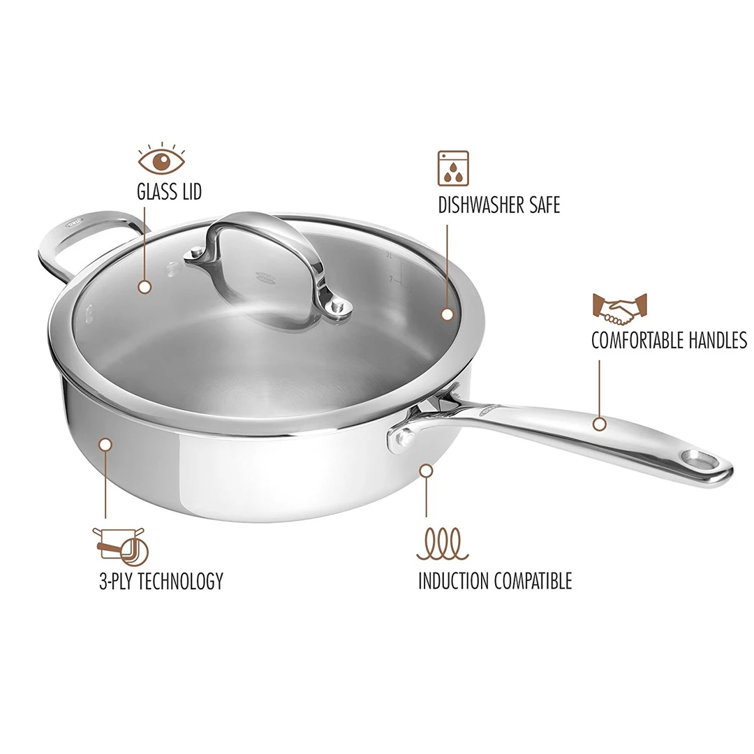 The OXO Good Grips 3-Ply Stainless Steel Pro line features the elegance and durability of stainless steel with the superior heat conductivity of aluminum. Each piece offers a thoughtful design, from 3-Ply construction and stay-cool stainless steel handles to drip-free pouring edges and round bottoms that facilitate stirring. The professional-grade materials ensure high-quality cooking performance and have a lifetime warranty. Clear, tempered glass lids make it easy to check the progress of your dish without lifting the lid. The durable, all-metal construction is perfect for all stovetops, including induction, and can move directly from the stovetop to oven or the broiler (safe up to 430 Degree Fahrenheit/220 Degree Celsius). The 3-Ply Stainless Steel Pro Cookware line is dishwasher safe for quick and easy cleanup. The 10″ Covered Skillet features a helper handle for easy carrying and is great for making home fries, sautéed vegetables, pasta and more.
