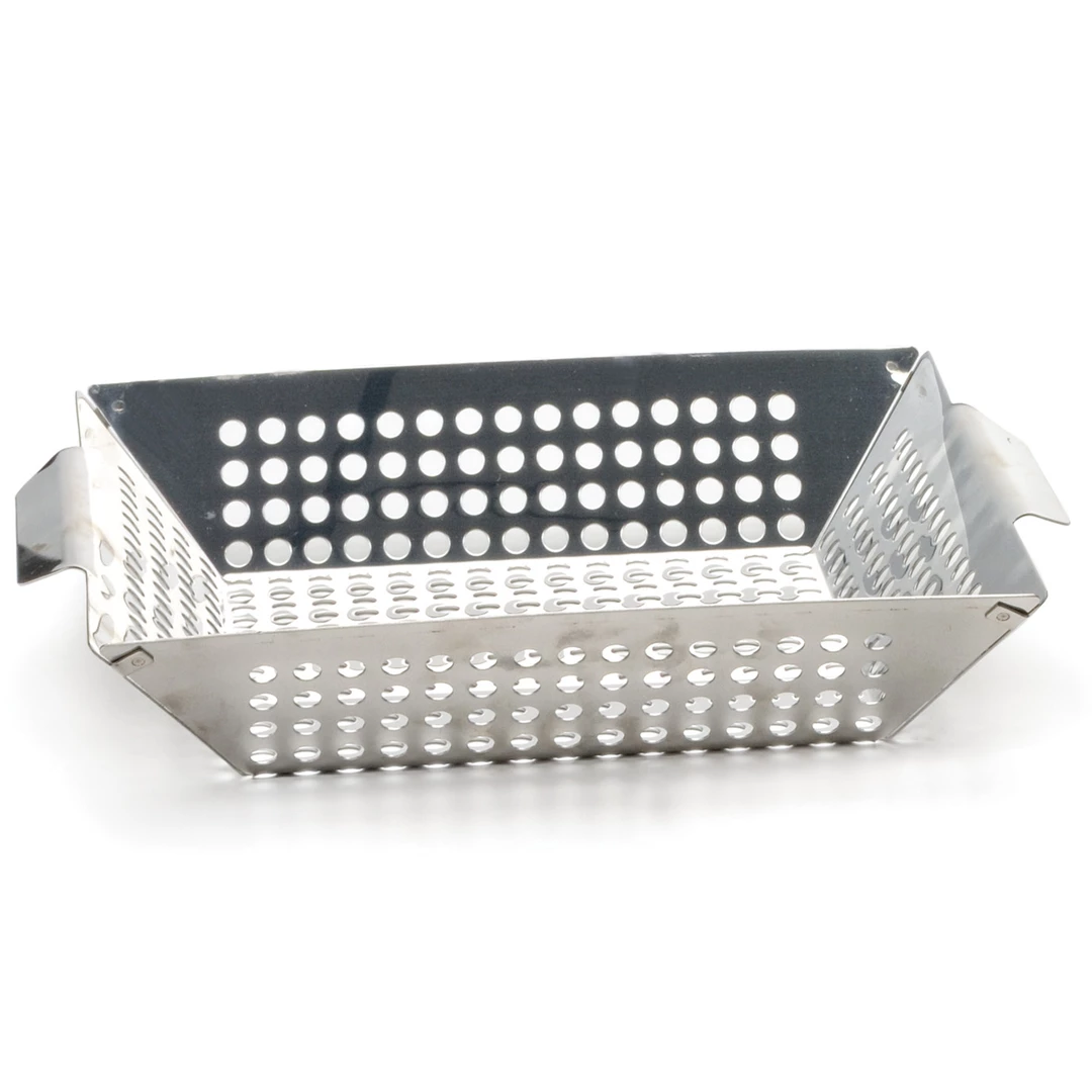 This grilling wok will contain small pieces of food and the slanting sides and large handles make it easy to toss and turn the food for even cooking. Made from heavy gauge stainless steel, it measures 12″ square and 2-1/2″ deep. The numerous small holes on the bottom and sides ensure the heat circulates evenly for perfectly grilled vegetables, seafood, chicken, etc.