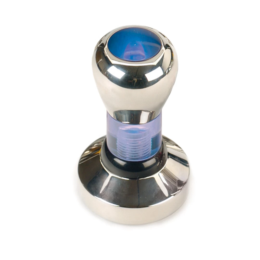Acrylic Top & Body: 58mm dia., convex bottom tamper, 18/8 stainless steel with blue acrylic accent. Hand wash.