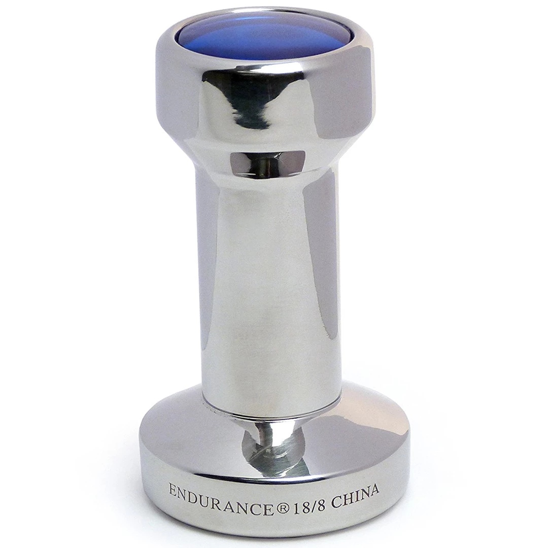 Like a little gem, this tamper has a translucent blue acrylic accent and 18/8 stainless steel body. 49mm dia., flat bottom.