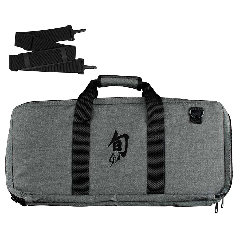 The Shun 20-Slot Knife Case is the safe and secure way to travel with your knives. It provides space for up to 20 knives in secure elasticized pockets. Rigid supports inside the case resist crushing and ensure your knives are well protected. Another section of the case has three zippered net pockets, ideal for any non-bladed kitchen tools that are part of your traveling kit. The exterior of the case has a business card carrier for easy identification. The case is made of PVC-laminated 600 denier woven polyester with heavy-duty nylon straps. It is fully zippered, has Velcro closures, and offers a padded, reinforced handle. A separator panel in the larger sections helps guard against scratching during transport. D-rings on either side of the case accommodate a heavy-duty carry strap. Embroidered with the Shun logo in black, the Shun 20-Slot Knife Roll is the easiest and most secure way to travel with your knives.