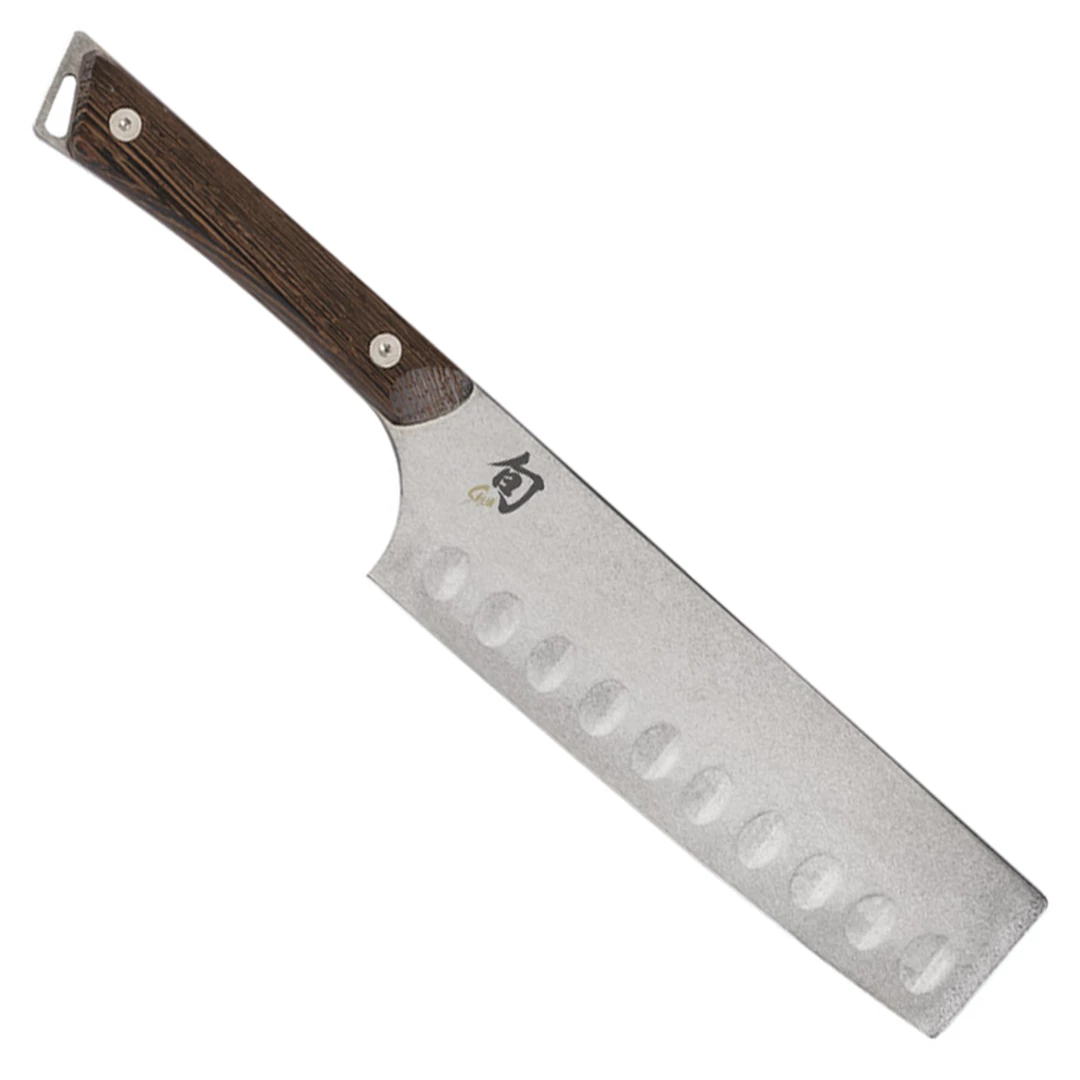 Nakiri is simply Japanese for “vegetable knife.” Once you get the Shun Kanso Nakiri in your hands, you’ll soon see why both professional chefs and good cooks around the world choose this beautiful and extremely useful tool whenever they have fruits or vegetables to prepare. With its straight blade, edge, and spine, the nakiri isnât rocked like a chef’s knife. Instead, use a simple push cut and enjoy the clean, swift work it makes of vegetables of all kinds. For daily salad preparation or slicing vegetables for stir-fry, it can’t be beat. Finely dicing onions is fast, easy, and with the Shun Kanso Nakiriâs blunt end, safer, too. The hollow-ground indentations in the blade help food release from the blade more easily, too.