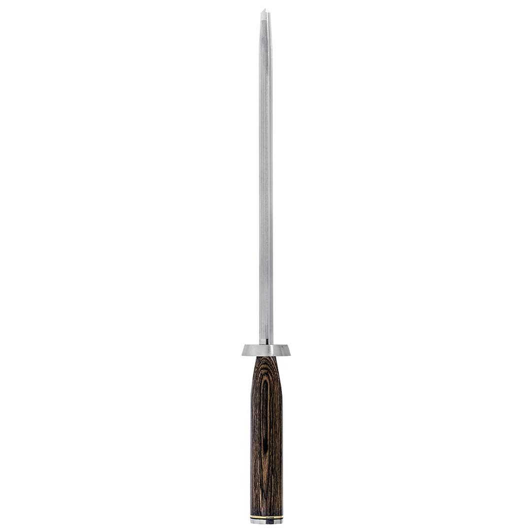 While fine European knives can require honing after each use, Shun’s harder steel means you can hone just once a week or so, depending on your level of use, of course. The Shun Premier Combination Honing Steel has an angle guide built into the handle, so you can easily hone your knives at the correct 16° Shun angle. The premium walnut PakkaWood handle provides a secure grip and matches the handles of the rest of the beautiful Shun Premier line.