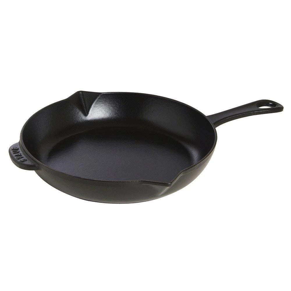 The Staub fry pan browns foods beautifully, be it chicken breasts, potatoes, or bacon. The enameled black matte interior imparts texture, promoting exceptional browning. Cast iron offers steady, even heat distribution, so the temperature of the pan won’t drop as you cook. Low, curved sides make it easy to flip the food, which releases easily.