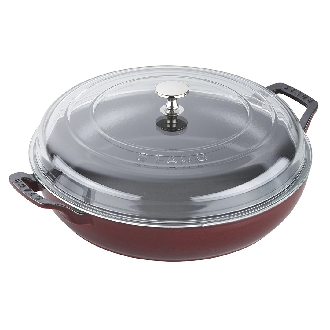 The 3.5-qt Braiser with Glass Lid is the perfect pot for one-dish suppers, braised lamb shanks, and breakfast hash. The heavyweight, domed glass lid locks in moisture and accommodates large cuts of meat. Home chefs can easily monitor cooking without removing the lid, ensuring flavors get sealed within each dish.