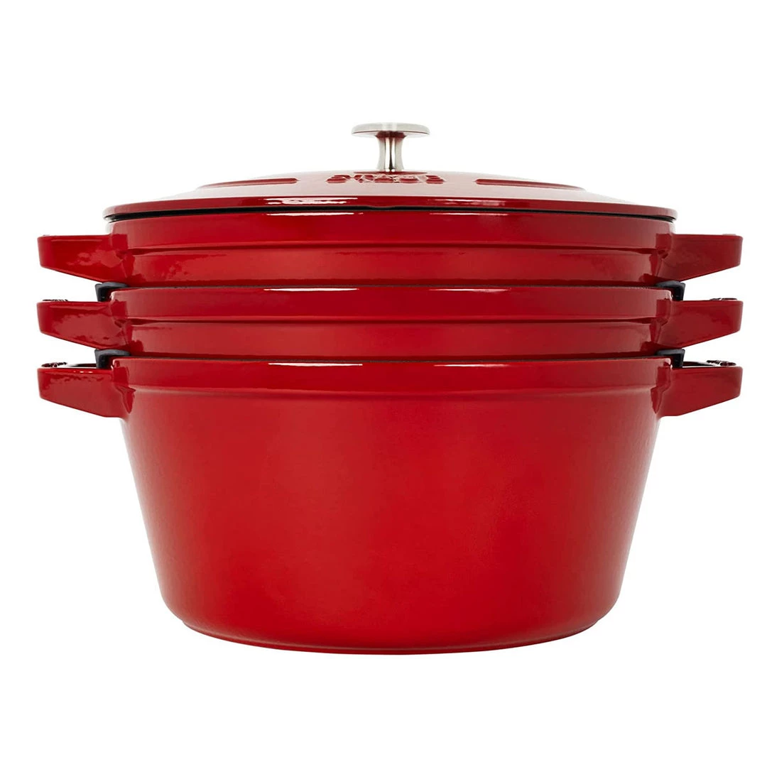 Introducing STAUB Stackable. Small Footprint, Big Results. STAUB Stackable is the ultimate spacing-saving set featuring the essential cookware pieces for all the ways you like to cook. Thoughtfully designed with sloped sides to accommodate nesting, STAUB Stackable fits neatly into any storage area, including shelves, cupboards, and pot drawers. The set features a 5.25-quart round cocotte, 3.5-quart braiser, 10-inch grill pan, and a universal lid that can be used on each piece. Cook soup on the weekend in the cocotte, braise chicken thighs midweek in the braiser, and grill burgers on the grill pan for a quick family meal. The set price boasts a 30% savings over buying each piece individually. Attachable rubberized bumpers are included to ensure each piece remains scratch-free when stacked and unstacked. Like all STAUB cast iron, the Stackable set is unsurpassed for slow-cooking meats and vegetables to tender perfection, and for simmering hearty stews and soups. Cast iron possesses exceptional heat-retaining qualities, so the pot heats evenly throughout. With a heavy weight, tight-fitting lid that retains moisture and tiny spikes on the lid interior that create a rain-forest effect evenly returning juices back onto food, you can expect moist, perfectly cooked food every time you use these pans. Rooted in French culinary heritage, STAUB cookware is beloved by professional and home chefs for its exquisite craftsmanship, exceptional performance, and timeless beauty. Each STAUB cast iron piece effortlessly and elegantly transitions from the oven to the table – you can cook and serve in the same dish. These heirloom pieces can be lovingly passed from generation to generation.
