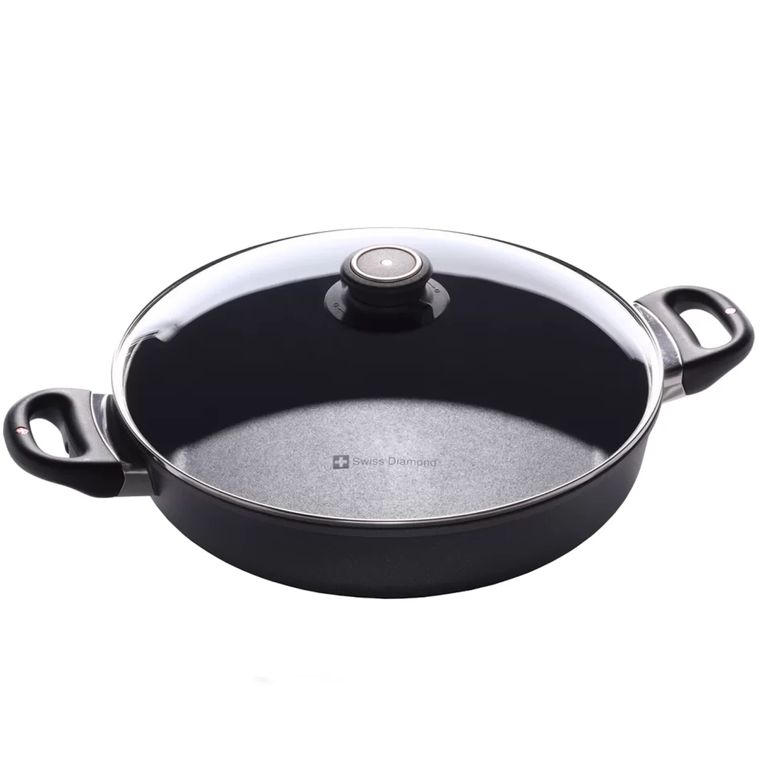 Perfect paella, creamy risotto – the Swiss Diamond 11 inch (3.7-quart) Sauteuse will be your new go-to piece of cookware for one-dish meals. With a cooking depth of approximately 2.4 inch, it sits comfortably on an oven rack and is the ideal size for easy stirring. Swiss Diamond’s patented nonstick coating is reinforced with real diamond crystals to provide excellent durability and performance. No more scrubbing or soaking – all you need is warm soapy water to get rid of stubborn food particles. The heat-tempered glass lid contains a steam vent for innovative moisture control. Dishwasher-safe, but we recommend hand washing. Induction version sold separately.