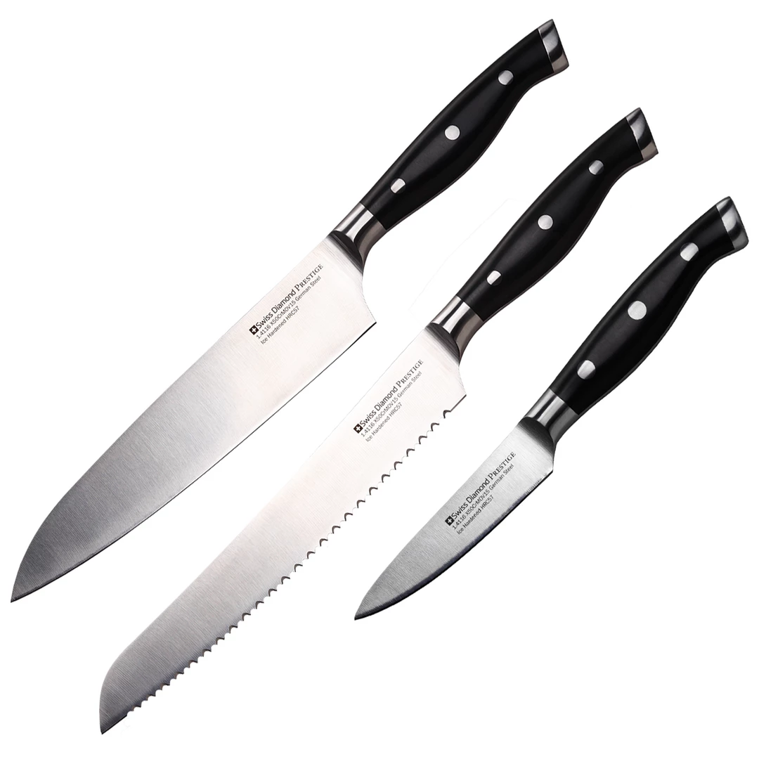 If you’re looking to try out Swiss Diamond Prestige Knives, but aren’t quite ready to invest in the Complete Knife Set, this Prestige Knives Three Piece Set is the perfect solution for you. Experience the power, versatility and control of the most popular and useful knives in the collection. Made from the highest-quality German steel and ice hardened for maximum blade strength, these knives will stay sharp through all the slicing, dicing, and mincing you throw their way.