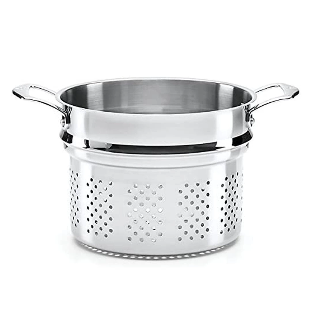 Entertain your guests with the lovely style of The French Chefs pasta steamer insert. In a sophisticated look, it is crafted from five ply stainless steel for durability and even cooking. The perfect piece for steaming pasta or veggies, The French Chefs pasta steamer insert also has riveted helper handles to assist while preparing meals.