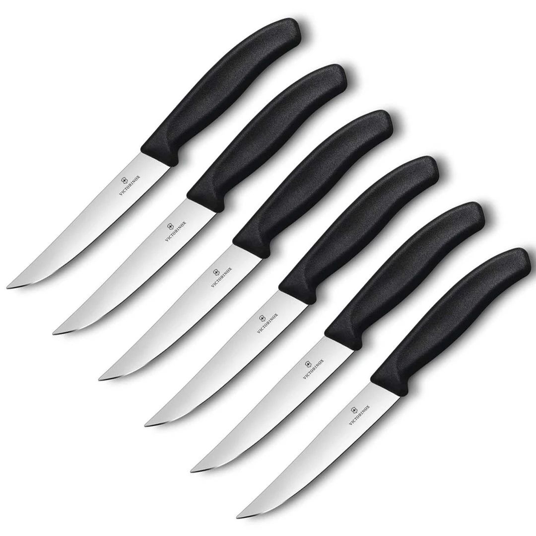 Extra-sharp blades on this precision steak knife set glide through porterhouse steaks or pork ribs effortlessly, retaining juicy moist flavor within the meat. Patented nonslip handles ensure a smooth comfortable grip for firm cutting control. Gaucho steak knives are beautifully balanced and perfectly weighted for ease in handling. Precision-stamped from high-carbon stainless-steel, the blade undergoes a special ice-tempering process to create a sharp cutting edge. Laser-tested for optimal cutting power. Ergonomic Fibrox handle with textured surface ensures a steadfast grip. Lifetime manufacturer warranty. Dishwasher-safe. Victorinox knives have been expertly crafted in Switzerland since 1884. Lightweight to prevent hand fatigue and world renown for quality-edge retention of the blade, Victorinox knives are top rated by leading consumer magazines. Product Features Extra-sharp blade quickly penetrates thick beef and pork cuts, retaining juicy flavor inside meat Efficiently penetrates meat, without tearing Beautifully balanced and perfectly weighted for ease in handling Precision-stamped, high-carbon stainless-steel for enduring performance Laser-tested for optimal cutting power Fibrox ergonomic handle with textured surface provides a steadfast nonslip grip Swiss-manufactured with the same high-quality standards of the Original Swiss Army Knife Victorinox maintains standards of excellence in the manufacturing of cutlery, earning the highest respect from professional and home chefs for quality knives